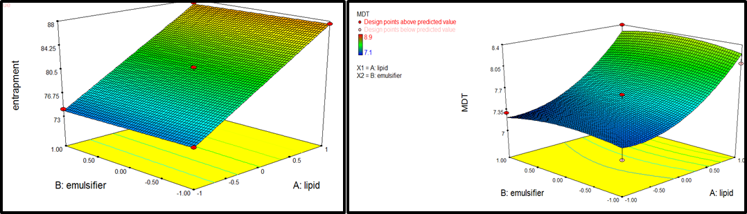 Fig. 2: 3D graph for entrapment efficiency, Mean dissolution time (MDT). The linear model for entrapment efficiency is evident from the 3D graph. The quadratic nature of the mean dissolution time explains that an increase in lipid increases the mean dissolution time, albeit in a quadratic nature. The emulsifier concentration has a less significant contribution as compared to the lipid concentration