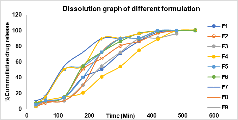 Fig. 3: Cumulative drug release graph. The dissolution was performed in triplicate and the average data for each formulation was used for plotting the cumulative release graph