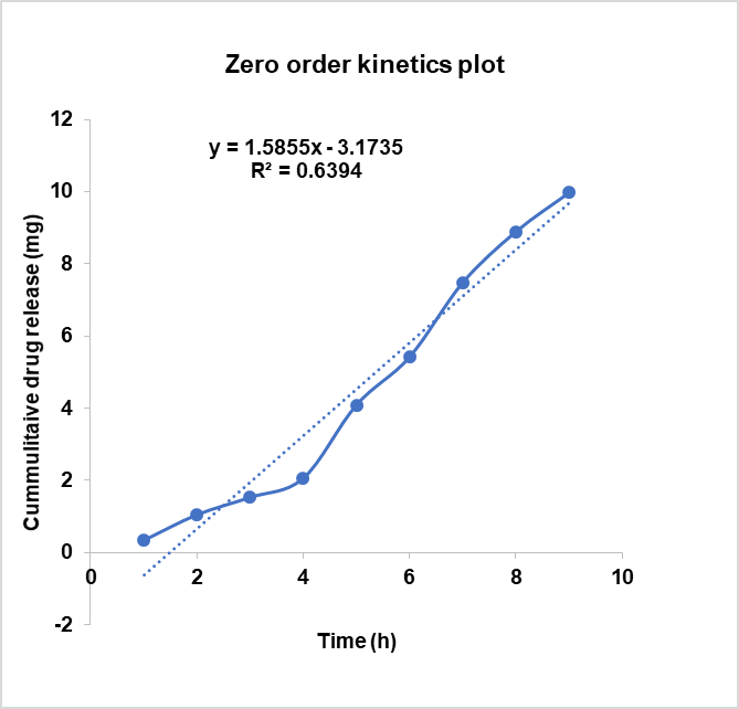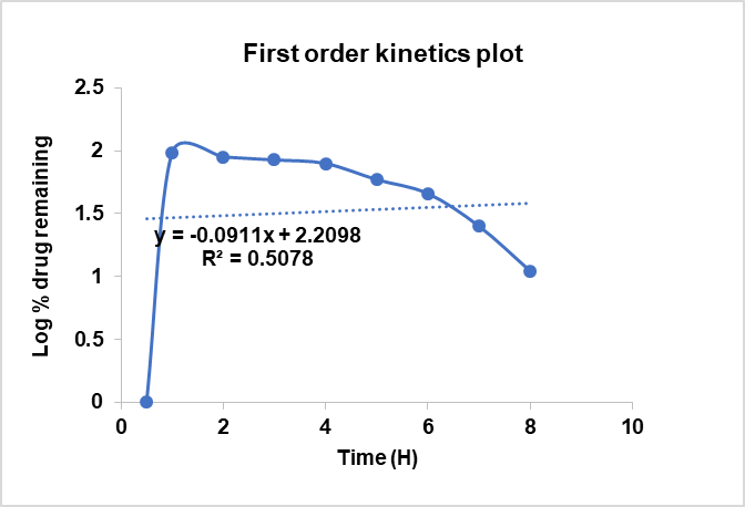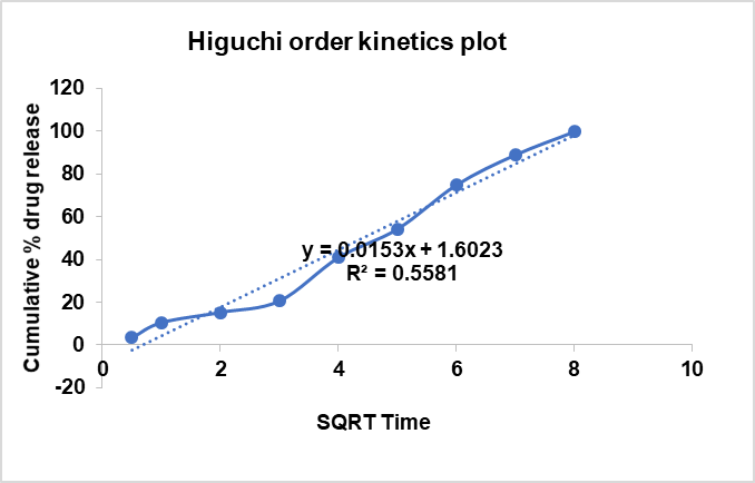 The dissolution data was plotted, and the regression of each kinetic model was found. The drug release pattern of the formulations is depicted as an 8-hour sustained release observed in fig. 3 and the release kinetics of the formulation was studied in fig. 4.