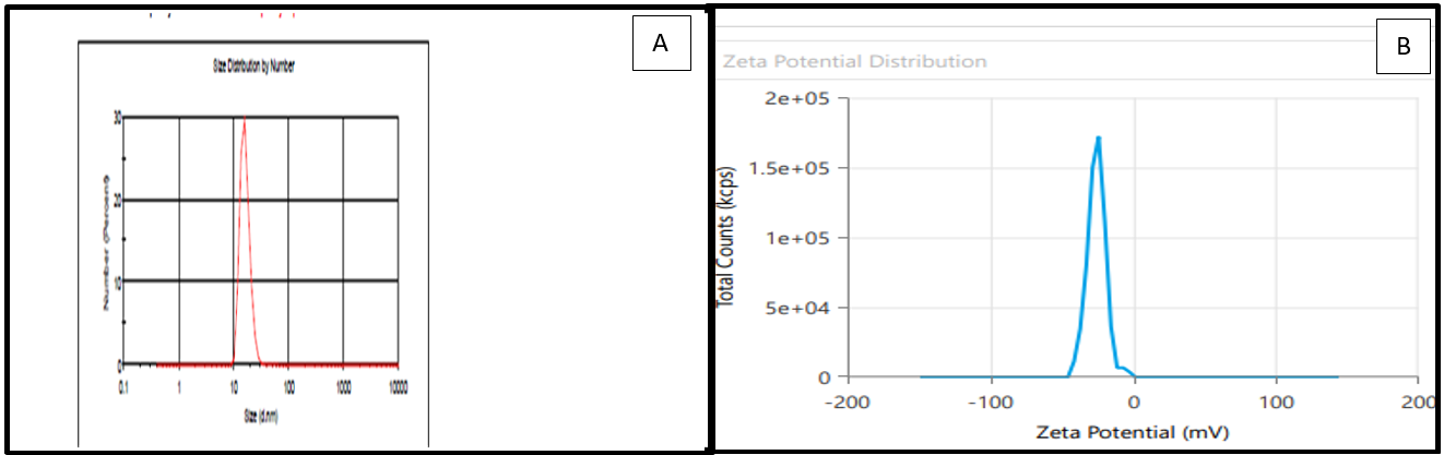Particle Size distribution of the optimized formulation was performed using the dynamic light scattering method. The particle size of the optimized formulation was 16.16+10 nm and the particle size distribution index to 0.729+002. The Zeta Potential value was found to be-25.43V. Fig. 5 shows the particle size of the optimized formulation and the zeta potential.