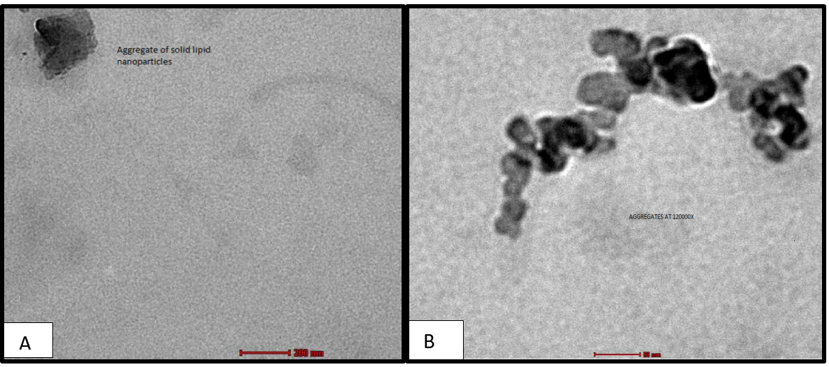 Fig. 7: A. Solid lipid nanoparticles Image under 45000X, B. Solid lipid nanoparticles under 120000X. The freshly prepared formulation dispersion was sent to the testing laboratory. The particle observed in the fig. was within in range of 50 nm. The small particle size of the nanoparticle was responsible for aggregation may be due to electrostatic forces. Increasing the zeta potential may prevent aggregation
