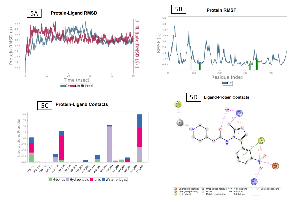 Protein-ligand contacts: Protein interactions with the ligand can be monitored throughout the simulation. These interactions can be categorized by type and summarized, as shown in the plot (fig. 5C). Protein-ligand interactions (or 'contacts') are categorized into four types: hydrogen bonds, hydrophobic interactions, ionic interactions and water bridges. Arg 100, Ala 134, Cys 135, Met332 Asn 352, Leu 355, and Gly 356 are amino acid residues engaged in hydrogen bond interactions with compounds, and other hydrophobic interacting residues include Trp354 and Lys 360, depicted in fig. 5C.