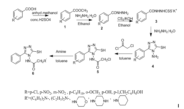 The reaction order given in Scheme 1 was used to synthesize the target compounds. Various substituted benzoic acids, when reacted with methanol in the vicinity of concentrated sulfuric acid gave methyl ester as a substitute for benzoic acid (1), which, upon reaction with hydrazide hydrate in absolute alcohol, furnished acid hydrazides (2). The (2) on reacting with potassium hydroxide and carbon disulfide in absolute ethanol afforded potassium dithiocarbazinate derivative (3), which was then treated with hydrazine hydrate in absolute ethanol and water to yield (4). The compounds (4) were made to react with chloroacetyl chloride in toluene to afford 5-aryl-4-(chloroacetylamino)-3-mercapto-1,2,4-triazole (5) The compounds (4) were made to react with amine in the presence of toluene to yield amino derivatives of 5-aryl-4(chloroacetylamino)-3-mercapto-1,2,4-triazole (6).(Scheme 1).