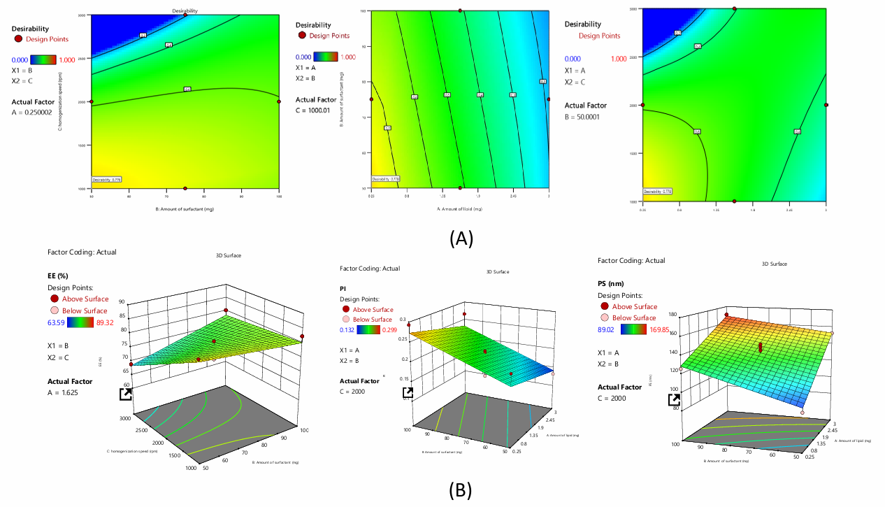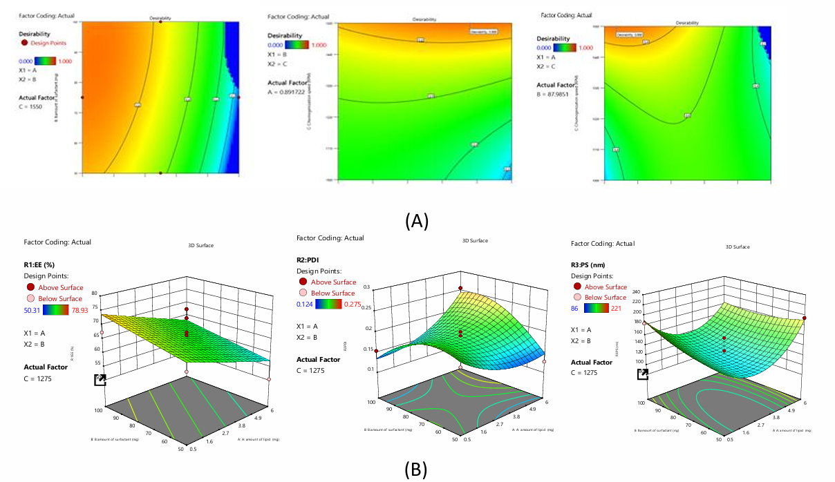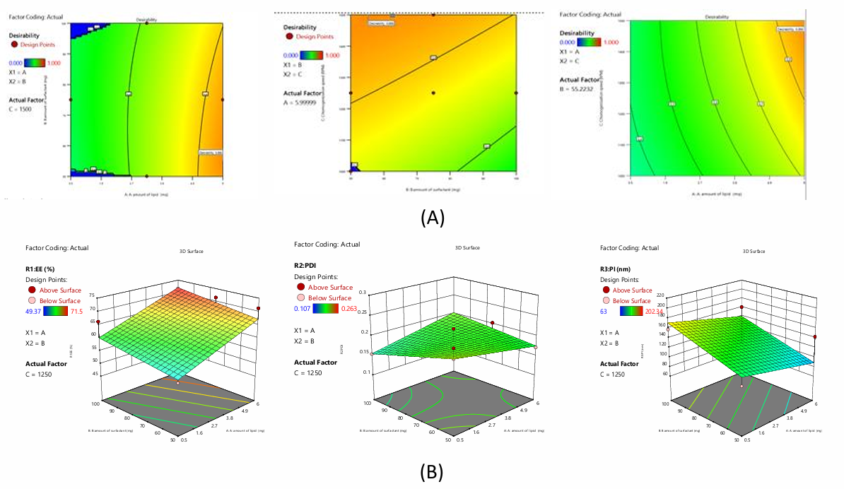 The investigation produced the polynomial expression, PDI=+0.215-0.016A-0.033B+0.047C. According to the equation, independent coefficients B and C have synergistic and antagonistic effects on formulation PDI.