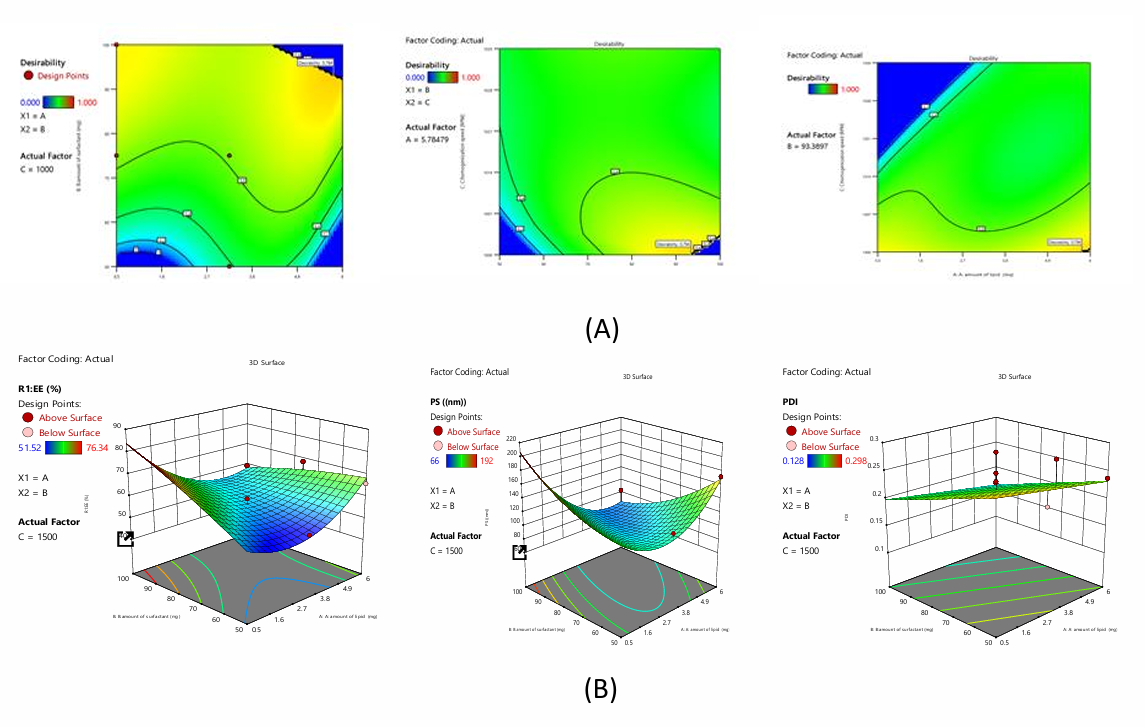 Fig. 1: A) Desirability and B) 3D plots of NAC-SLN using BBD