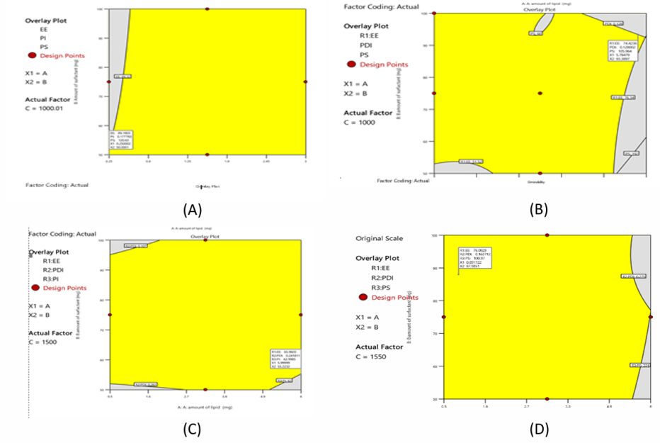 Following the transformation of all three answers (R1: EE, R2: PDI, and R3: PS) into desirability scales based on the desirability value (0.778), the formulation NAC-PLHP 9 was chosen as the best option. This is demonstrated in fig. 5D. The subsequent attractiveness criteria for the best formulation are displayed on the overlay plot, which includes the following: PS is 125.23 nm, PDI is 0.172, and EE is 68.93 percent. Homogenisation at 1550 revolutions per minute, 0.893 mg of lipid, and 87.9 mg of surfactant are all desirable characteristics for independent variables.
