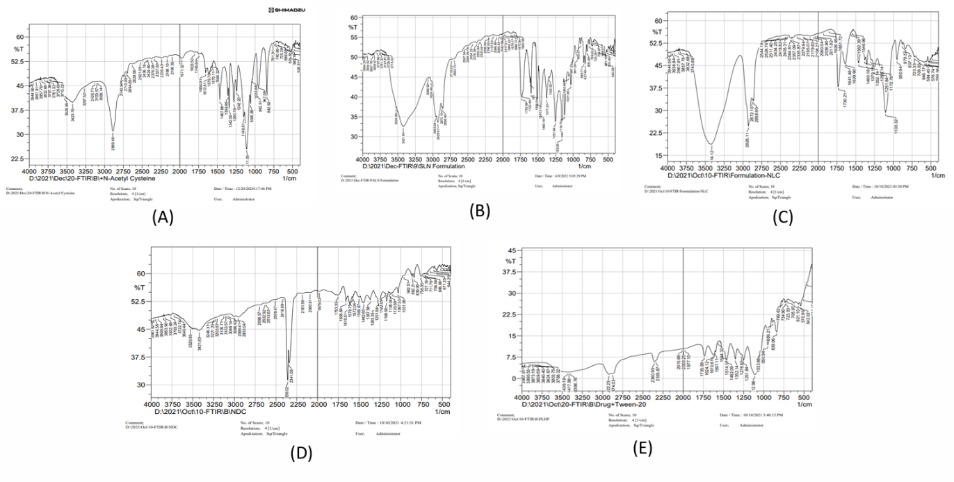 Fig. 6: FTIR spectra of A) Pure drug B) NAC-SLN C) NAC-NLC D) NAC-NDC E) NAC-PLHP