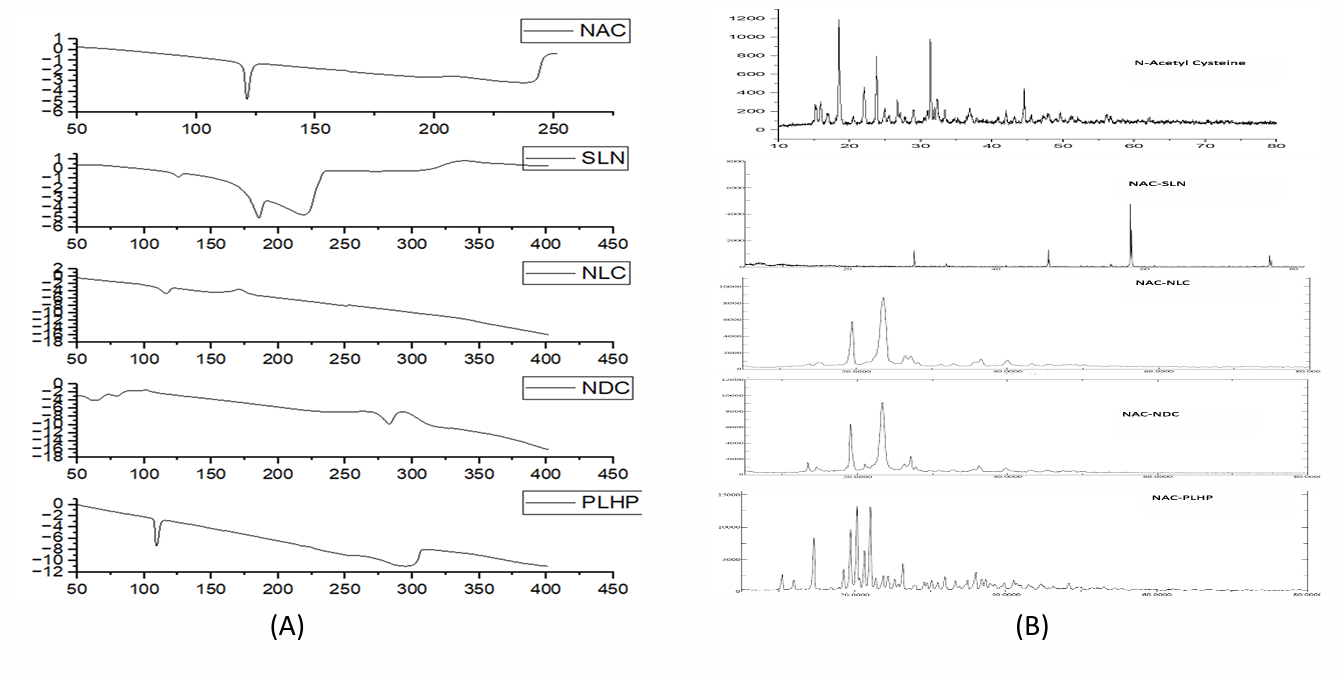 Fig. 7: DSC and XRD spectra of A) Pure drug B) NAC-SLN C) NAC-NLC D) NAC-NDC E) NAC-PLHP