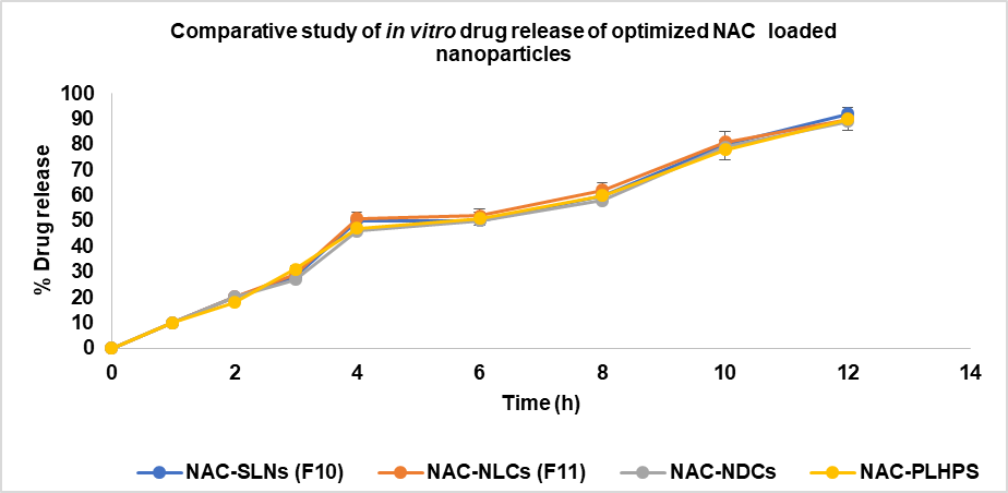 All of the NAC SLN formulations were subjected to drug release studies that lasted for a total of twelve hours and utilised dissolution apparatus. According to the findings, the NAC-SLN F10 exhibited a drug release rate of 92.30±0.46 in vitro. A total of 90.1±1.86 medicines were released by NAC-NLC F11 in vitro. A total of 85.72±1.64 medicines were released by NAC-NDC F11 in vitro. A total of 86.25±1.43 medicines were released by NAC-PLHP F9 in vitro.