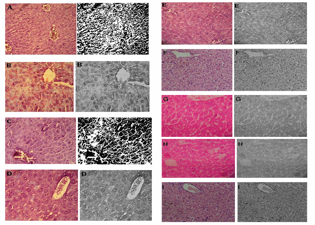 Fig. 10: In vivo hepatoprotective activity of the optimized formulation and their Image J ®software analysed images respectively, A: Negative control, B: Positive Control (CCl4 treated), C: CCl4+LD NAC-SLN, D: CCl4+MD NAC-SLN, E: CCl4+HD NAC-SLN, F: CCl4+LD NAC, G: CCl4+MD NAC, H: CCl4+HD NAC, I: CCl4+SILY