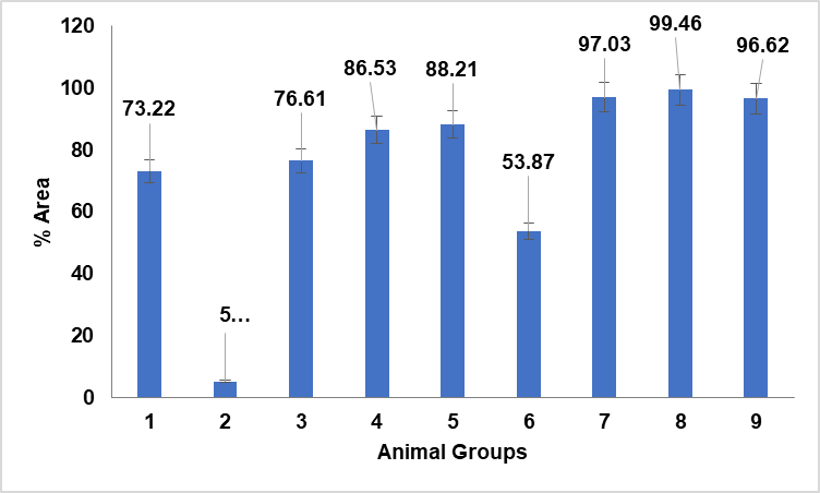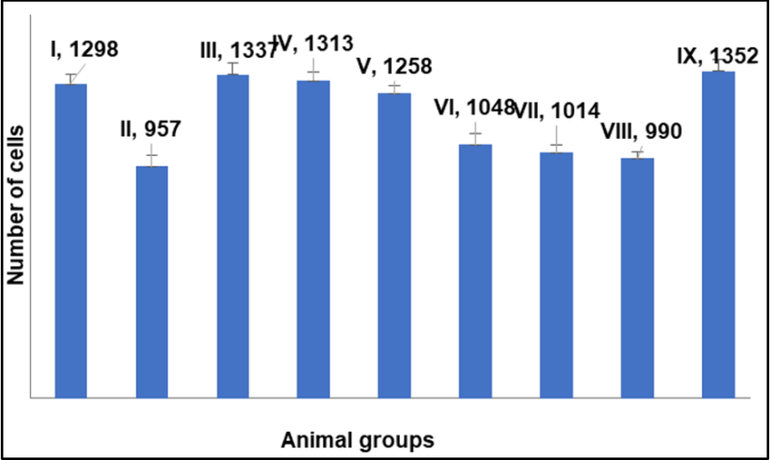 Quantitative calculation of liver section area for NAC, NAC-SLNs, and CCl4-treated animal groups utilised in in vivo research. Fig. 11 illustrates the percentage of cell vasculature in comparison to the control group (Group I) and the CCl4-treated group (Group II). Elevated levels were seen in NAC-treated groups VII and VIII. Group IX, administered silymarin, was more prevalent. Approximately equivalent in NAC-SLN groups III, IV, and V. Vascular damage and excessive dosage accumulation may occur with moderate doses of NAC and nanocarriers (SLN). In a quantitative comparison of NAC-SLN to NAC and silymarin, low-dose NAC-SLN exhibited cell counts more closely aligned with the negative control group (fig. 12). NAC-SLN constitutes an efficacious low-dose treatment with effects comparable to those of the negative control group.