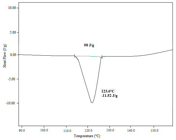 The PXRD patterns of azelnidipine and its solid dispersion (AF 6) were traced using an X-ray diffractometer (Bruker AXS). The diffraction pattern shows multiple distinct peaks at a diffraction angle of 2ɵ throughout the scan range, indicating the highly crystalline form of the pure medication azelnidipine. The PXRD pattern of solid dispersions of azelnidipine shows a notable decrease in crystallinity because there are no sharp, distinct peaks. The PXRD of the azelnidipine solid dispersions (AF 6) thus demonstrated the amorphous form of the drug complexed in the carrier polyethylene glycol-6000 fig. 5 represents the amorphous nature of the solid dispersion by a slight shift in the melting endothermic peak of solid dispersion of azelnidipine at 120.7 °C when compared with the pure drug at 123.6 °C. Boghra RJ et al. further confirmed conversion of crystalline form of Irbesartan to amorphous form in solid dispersion [25].