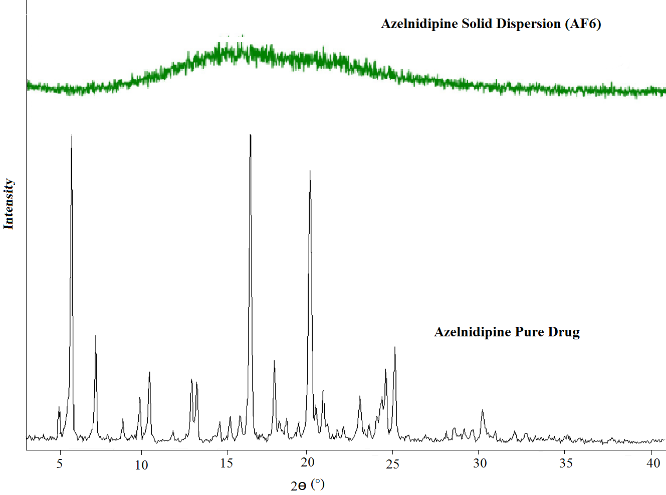 Fig. 6: PXRD Pattern of azelnidipine, azelnidipine solid dispersion (AF 6)