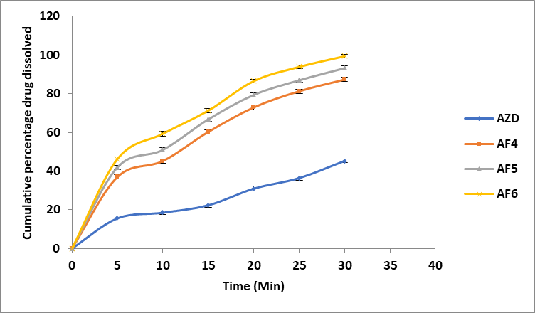 The paddle method was employed to investigate the dissolution of azelnidipine in both its pure drug form and in solid dispersions in a 6.8 pH phosphate buffer. It was found that all solid dispersions dissolved more quickly when compared to the drug's pure form, azelnidipine. The drug release kinetics of each dispersion adhered to the first-order law. With a drug-to-polymer ratio of 1:3, formulation AF 6 prepared by the fusion method released the drug more quickly than other solid dispersions made by physical mixing and solvent evaporation. It has been observed that as the polymer content increases, so does drug release.