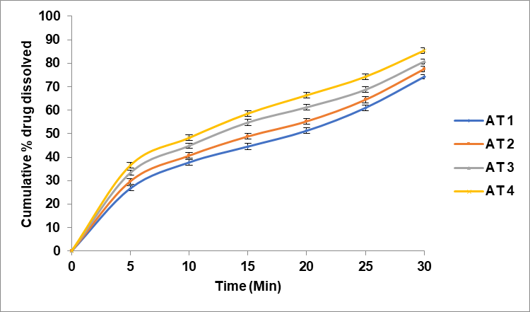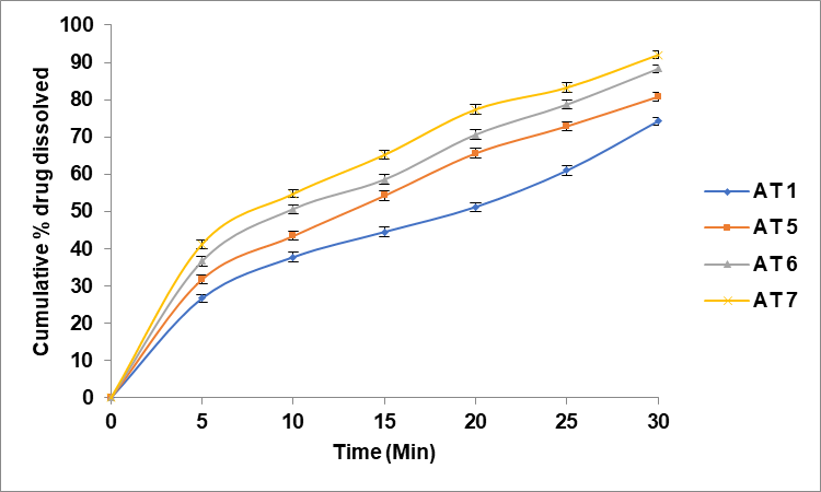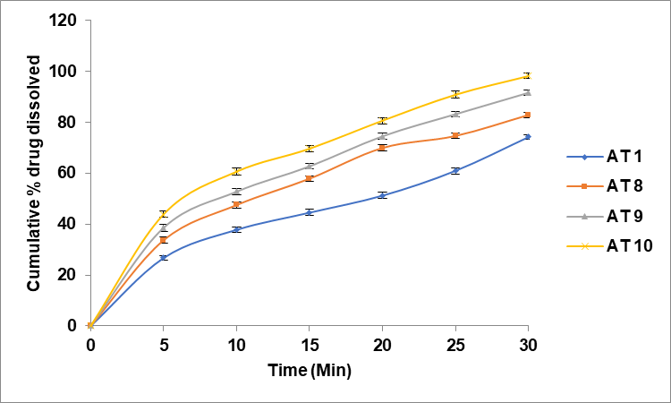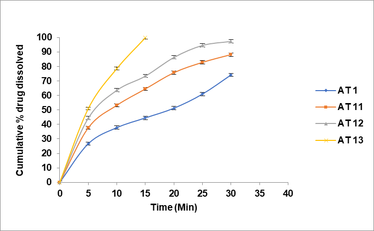 The rate of release of each tablet followed first-order kinetics (table 5). Microcrystalline cellulose-polyethylene Glycol (MCC-PEG) was used as a super disintegrant in Formulation AT 13, which was found to exhibit a higher dissolution rate than the other formulations based on in vitro dissolution experiments of fast-dissolving tablets. The drug was released in the following order by fast-dissolving tablets containing various super disintegrants: MCC-PEG>CP>CCS>SSG. It can be concluded that MCC–PEG conjugate can prove to be a best superdisintegrant after comparing its results with that of commercial superdisintegrants. Mangesh R. Bhalekar et al. study also confirmed this improved drug release of the fast-dissolving tablets with MCC-PEG conjugate as superdisintegrant [19]. Formulations with higher concentration of MCC-PEG achieved faster dissolution times compared to those with lower concentrations or alternative disintegrants.
