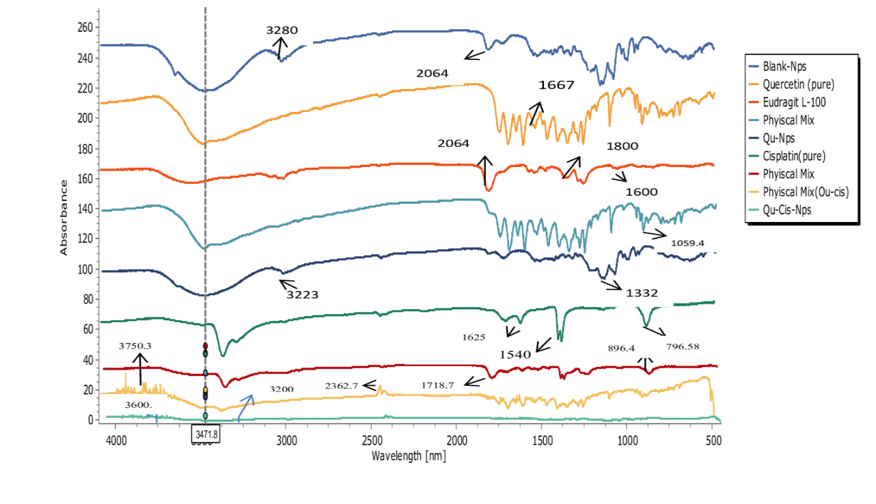 Fig. 1: FT-IR spectra of blank NPs, Qu (pure), Eudragit® L-100, Physical mixture of (Qu/Eudragit® L-100), Qu-loaded NPs, Cis (pure), Physical mixture of (Cis/Eudragit® L-100), Cis-loaded NPs, Physical mixture (Qu-Cis/Eudragit® L-100), (Qu-Cis)-NPs