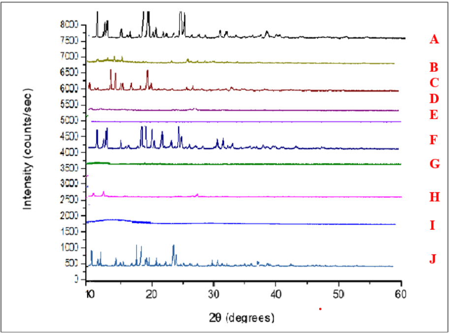 Fig. 2: (A) Blank NPs, (B) Physical mixture (Qu-Cis/Eudragit® L-100), (C) Cis-loaded NPs, (D) physical mixture (Cis/Eudragit® L-100), (E) Cis (pure), (F) Qu-loaded NPs, G)Physical mixture (Qu/Eudragit® L-100, ), , , (H) Qu (pure), (I) Eudragit® L-100, (J), (Qu-Cis) NPs