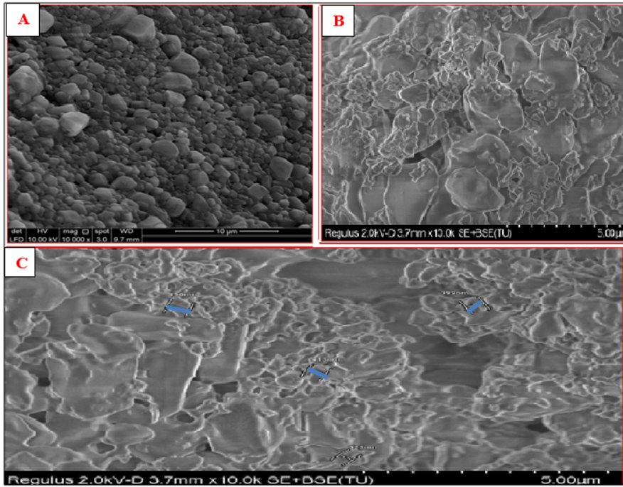 Fig. 3: A. The scanning electron microscope images of blank NPs. Mag (10.000X), B, C. The ultra-electron microscope images of optimized co-loaded (Qu-Cis)-NPs (5.00 µm high-resolution scanning)