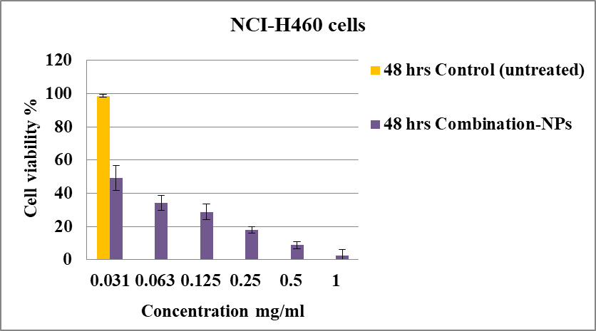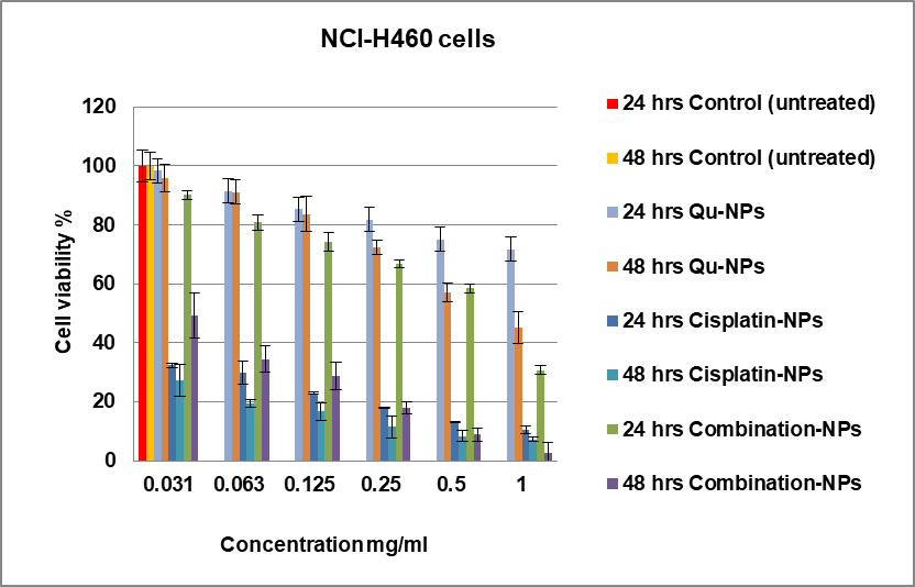 Fig. 5: Cytotoxicity effects of (Qu-Cis)-NPs in NCI-H460 cells after 48 h of incubation. Data expressed as mean±SD, n=3
