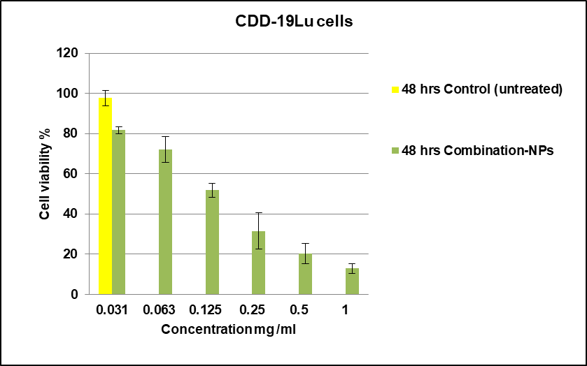 Fig. 7: Cytotoxicity effects of (Qu-Cis)-NPs in CDD-19Lu cells after 48 h of incubation. Data expressed as mean±SD, n=3