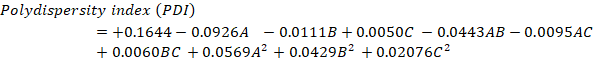 Impact on EE ranges from 74.77 to 31.04%. The nanobubbles with high entrapment is always desirable to reduce the dose of the drug. The model's F value (27.27), with a probability of 0.01%, suggests significance and minimal fit error for the proposed quadratic model, likely not attributable to noise. The lack of fit's F-value (0.48) is n't statistically significant based on pure error, with a 71.16% probability of being noise. ANOVA identified significant factors (p-value<0.0500), leading to removal of non-significant variables. In fig. 4, you can see the response surface and contour plots that demonstrate the impact of variables on EE. The regression coefficients, such as R², adjusted R², and predicted R², were calculated at 0.9723, 0.9366, and 0.84501, respectively. The predicted R² is very close to the adequate R², with a difference of just 0.2. The model exhibited satisfactory accuracy with a signal-to-noise ratio of 17.3667, surpassing the minimum threshold of 4, showcasing its effectiveness in investigating the design space. Key model terms such as B, C, D, AB, AC, A², B², and C² displayed notable impacts with p-values<0.050. The resultant regression equation can be expressed as: