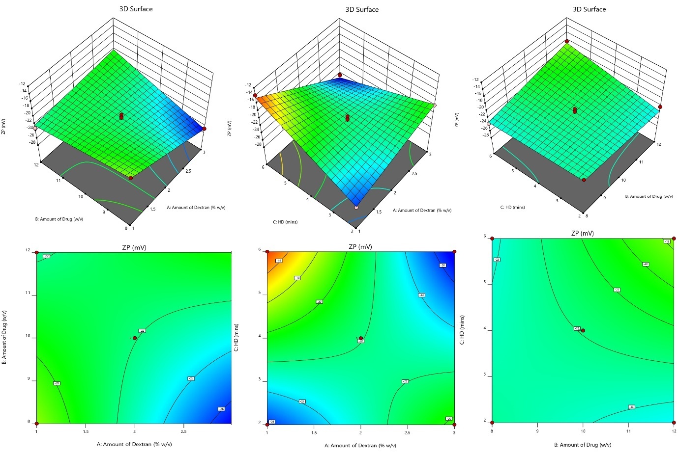 The three independent variables were the amount of Dextran (w/v), amount of the drug (w/v) and homogenization speed (rpm), each at three levels of variation: low (-1), middle (0), and high (1). The response (four related variables) was Particle Size (PS; Y1), Polydispersity Index (PDI; Y2), Zeta Potential (ZP; Y3), and Encapsulation Efficiency (EE%; Y4); table 1 lists their respective ranges. The response surface search was conducted using Design Expert® tools (Version 12.0.3.0, Stat-Ease Inc., Minneapolis, MN), and response surface charts and contour (2D) plots were employed for analysis [21].