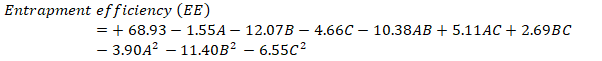 This equation reveals that EE is affected by variables A, B, and C as well as their interactions. Specifically, increasing A and B leads to a decrease in EE due to their negative linear coefficients; conversely, increasing C enhances EE, as indicated by its positive linear coefficient. Among the interaction terms, AB has a negative coefficient, suggesting that the combination of A and, B decreases EE. In contrast, the interactions AC, and BC show positive coefficients for AC and BC, indicating that these combinations increase EE. Additionally, the quadratic terms for A2, B2, and C2 are negative, demonstrating that higher levels of each factor individually lead to a decrease in EE.