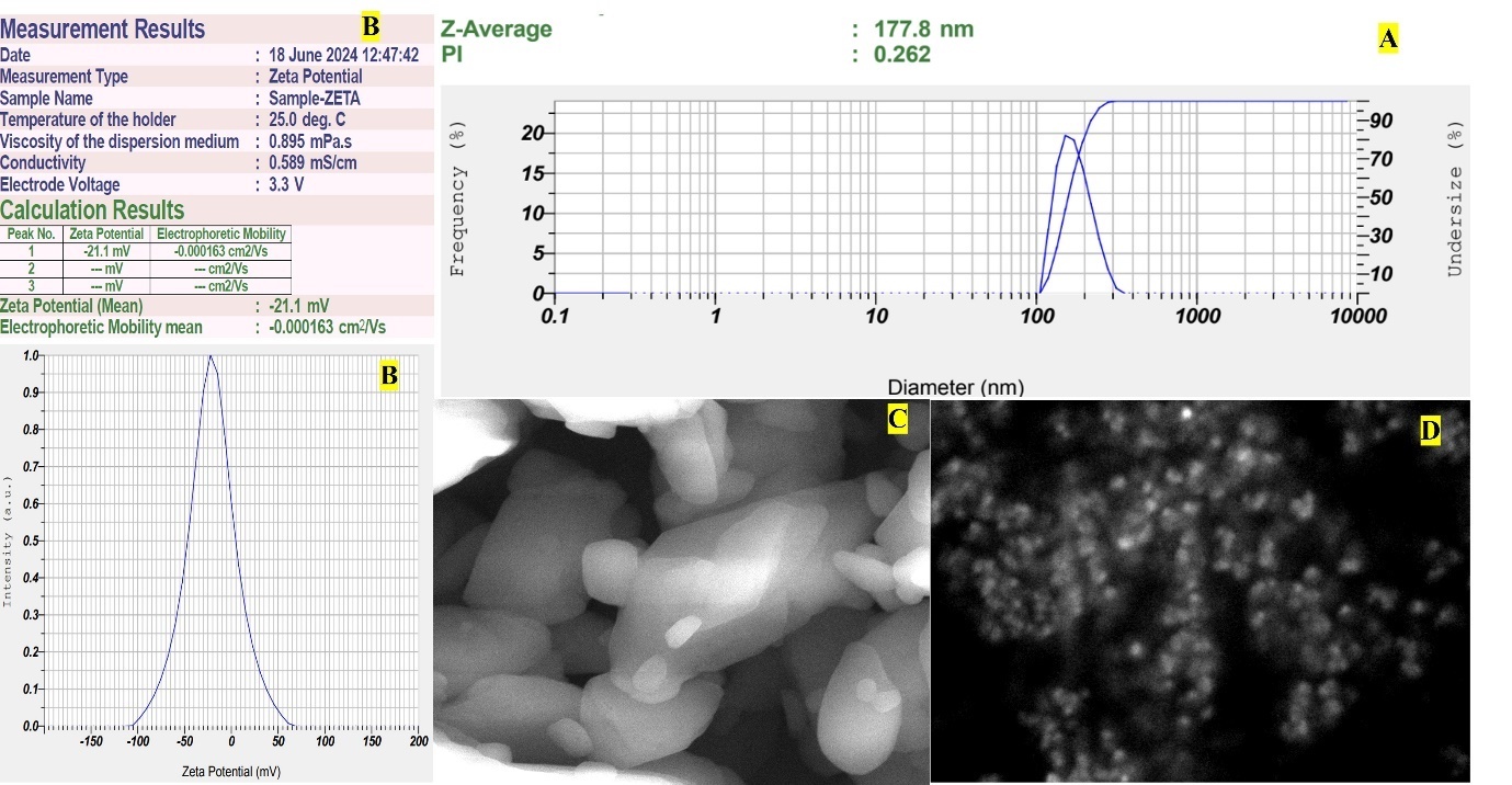 Fig. 6 depicts the surface properties of the formulation and the drug. The drug in its initial state, displays a broad range of PSs and irregular cubic shapes with micrometer-sized particles. Conversely, when the drug is transformed into nanobubbles, it produces spherical nanoparticles consistently measuring below 200 nm, as verified by the zeta sizer. This research showcases the successful achievement of nanosizing the drug through nanobubble formation, resulting in particles within the nanometer scale and exhibiting a low PDI [19].