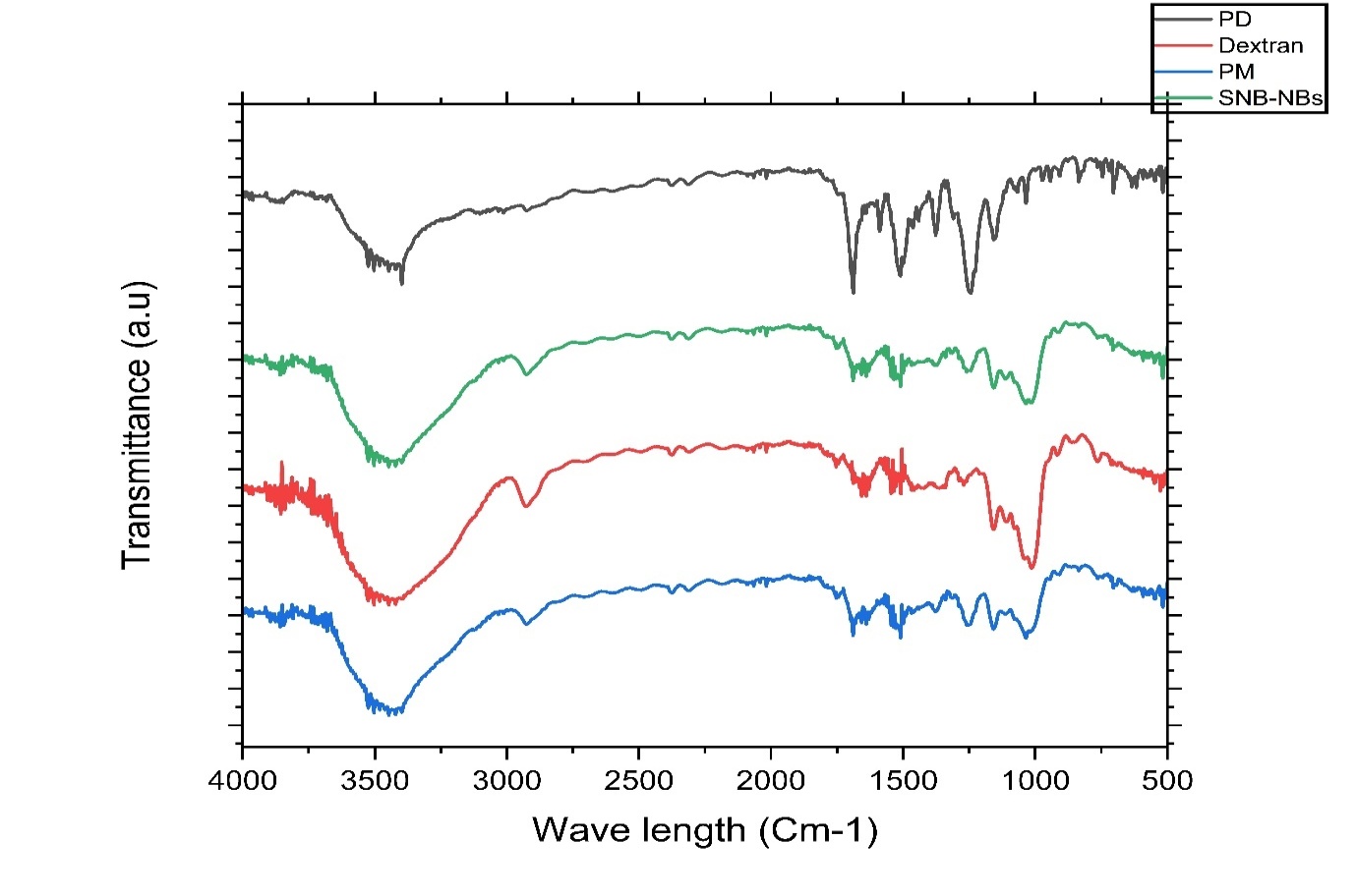 The spectrum of FTIR was obtained using spectroscopy Perkin Elmer (Model 1600; USA). The pure drug, dextran, Physical Mixture (PM), and the optimized drug-loaded Nanobubbles were all analyzed at wave numbers 4000-450 cm-1 with a resolution of 1.0 cm-1 [11].