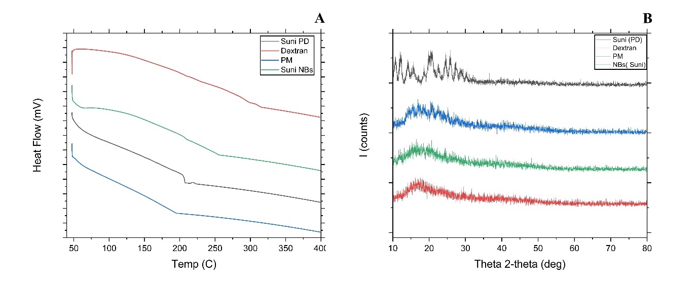 Fig. 8: A) Overlay of DSC thermograms of i) Suni-PD (black line); ii) Dextran (red line); iii) PM-physical mixture (blue line); iv) Formulation (optimized Nanobubbles green line); B) Overlay of XRD of i) Suni-PD (black line); ii) Dextran (red line); iii) PM (blue line), iv) Formulation-nanobubbles (Green line)
