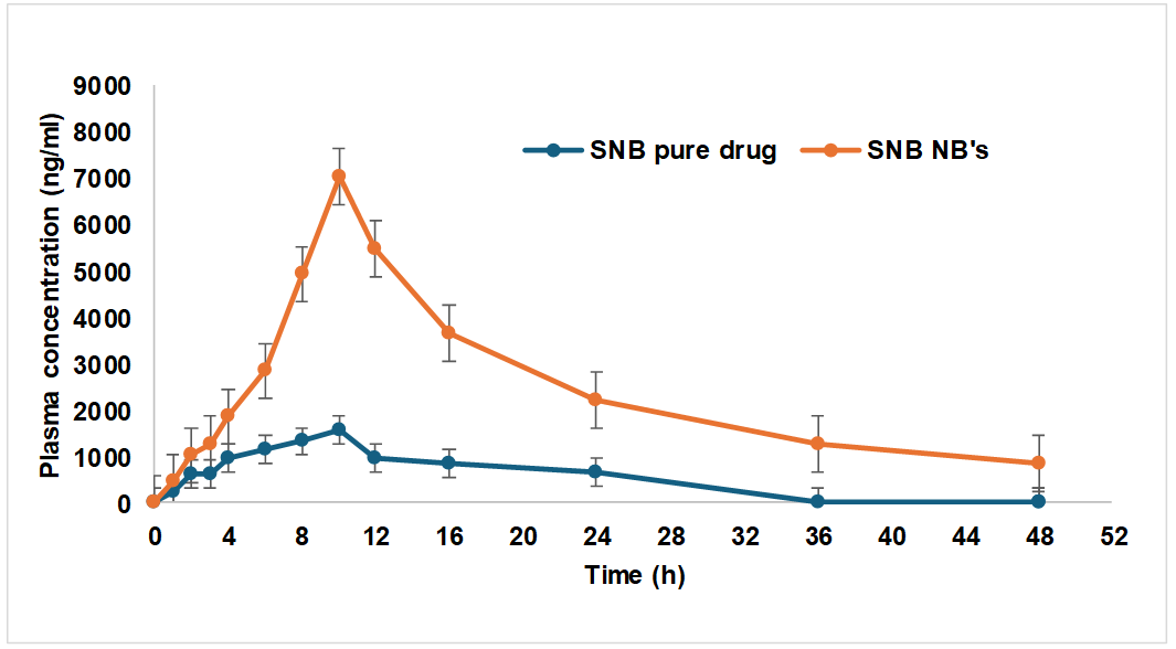 The male Wistar rats, with an average weight of 200±20 g and aged 4-5 w, were obtained from the Nutrition National Institute (NIN) in Telangana, India. The study followed the guidelines for the Care and Use of Laboratory Animals and received approval from the Institutional Animal Ethics Committee (IAEC) under protocol number 1447/PO/Re/S/11/CPCSEA-91/A. The animals were placed in natural light/dark cycles for a period of seven days, adjusting to a humidity level of 40–60% and a temperature range of 20ºC±2ºC. After that, they were randomly divided into two groups of six animals. The optimized drug-loaded nanobubbles (20 mg/kg BW) and the pure drug (dispersed in 0.5% w/v carboxymethylcellulose) were administered by oral route. The animal blood was obtained from the retroorbital plexus (300 µl**) and then transferred into sterile test tubes with Ethylenediaminetetraacetic Acid (EDTA) at specific intervals (1,2, 3, 4, 6, 8,10, 12, 16,20, 24, 36, and 48 h). Blood samples were centrifuged at 8500 rpm for ten minutes using an Eppendorf centrifuge. The plasma that was extracted underwent processing and analysis through HPLC following the method development outlined above. Non-compartmental analysis WinNonlin (version 3.1; Pharsight et al., USA) was employed to calculate the Cmax (Maximum Plasma Concentration), (AUC0-48) area under plasma concentration vs time curve from 0 to 48 h, Tmax (time to reach the maximum plasma concentration, Kel (elimination rate constant, t1/2 (half-life). All the data were expressed as mean±SD.