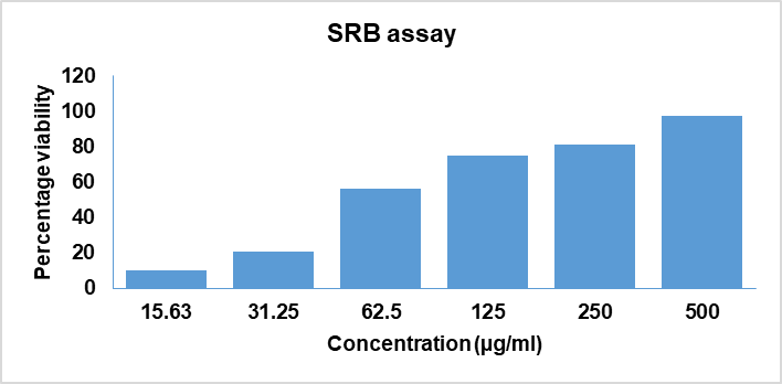 To test the cytotoxicity of the extract, 5,000 cells per well were seeded in 96-well plates using 100 µl media. Following a 24-hour period of cell seeding, the cells were exposed to treatment with extract at various concentrations (500 to 15.62 µg/ml). Meanwhile, cells that were not exposed to any treatment were added with an equivalent volume of media, functioning as the control group. Using the SRB assay, cell growth inhibition was performed following a 48 h incubation period. The cell monolayer formed is coloured for 60 min after being fixed with 10% trichloroacetic acid. Following the incubation period, trichloroacetic acid was removed and the wells were dried after three rounds of washing with distilled water. 100 µl** of 0.057% sulforhodamine B solution in acetic acid (1% v/v) was added, kept in dark for 30 min. 200 µl** of Tris base (10 mmol) was added to the wells to dissolve the dye bound to the protein. A multiplate reader (BioTek Instruments Inc. ELx800) was used to examine the absorbance at 540 nm. The IC50 values were calculated using graph pad prism 7 [15, 16].