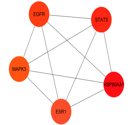 The PPI network was depicted by Cytoscape v3.10.1. and its topological parameters were examined using Cytoscape Network Analyzer tool [19]. Using the String database v2.0.1, the PPI network of shared targets between the active drugs and colon cancer was constructed; a confidence score of 0.7 is determined as the optimum score. The software extension CytoHubba was subsequently employed to compute the hub targets based on network node's topological characteristics and target genes [20].