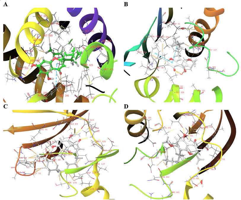 Fig. 5: IFD 3D interaction diagram (A) 5375797-5GTR (IFD score:-487.09), (B) 613040-4BQG (IFD score:-450.20), (C) 5375797-2ZOQ (IFD score:-737.56), (D) 613101-6VHN (-587.54)