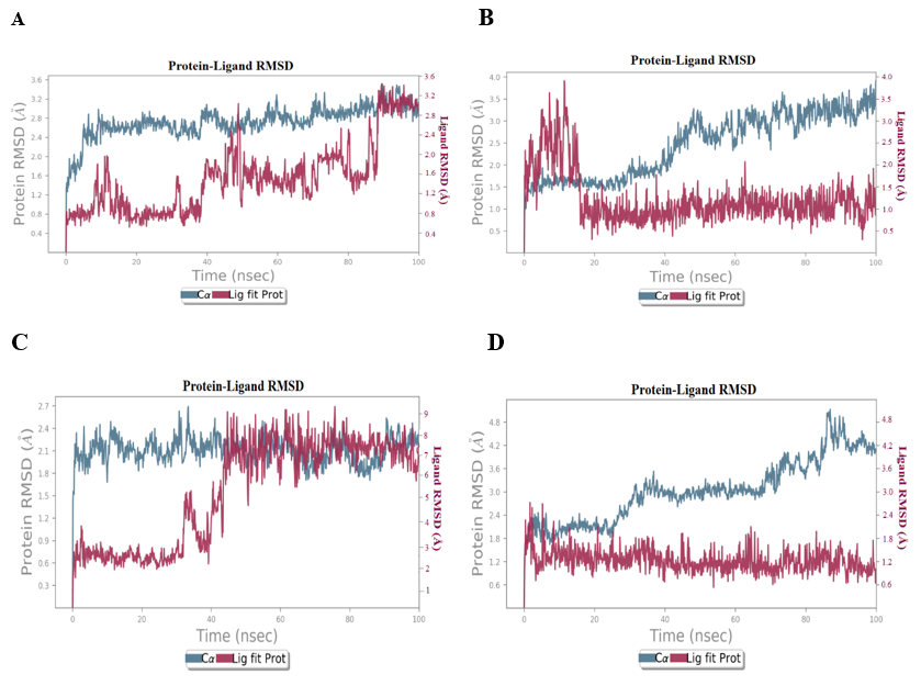 Fig. 6: RMSD Plots (A) 5375797-5GTR complex, (B) 613040-4BQG complex, (C) 5375797-2ZOQ complex, (D) 613101-6VHN complex