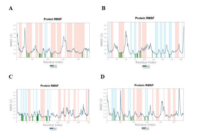 Fig. 7: RMSF Plots (A) 5375797-5GTR complex, (B) 613040-4BQG complex, (C) 5375797-2ZOQ complex, (D) 613101-6VHN complex