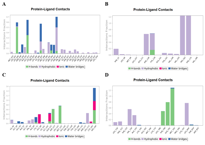 The protein-ligand contact pertains to the length of time during which the protein and the ligand interact during MD simulation run. A value of 0.4 signifies that the contact persisted for 40% of the total duration of the simulation, but value higher than 1 implies that there may be more interactions between the ligand and the protein's amino acid residue. The compound 5375797 demonstrated H-bond interactions with LEU349 and GLU 353 of 5GTR protein, which persisted for 60% and 65% of the simulation run, respectively. The compound 5375797 also formed a pi-pi interaction with PHE 404 residue of 5GTR protein, which lasted for 70% of the simulation run (fig. 8A). Several sustained interactions occurred between compound 613040 and residues TRP 162 and PHE 170 of 4BQG throughout the experiment. Pi interactions were also established between compound 613040 and PHE 138 and TYR 139 of 4BQG for a duration of 65% (fig. 8B). The compound 5375797 shared H-bond interactions with ASP123 and MET125 of 2ZOQ and these interactions lasted for 40% of simulation run. The compound 5375797 had multiple interactions with the residues ASP 184 of 2ZOQ that lasted throughout the experiment (fig. 8C). The compound 613101 formed hydrogen bonds with the key amino acid residues THR 790 and MET 793. These interactions were present for 50% and 100% of the entire simulation duration, respectively (fig. 8D).