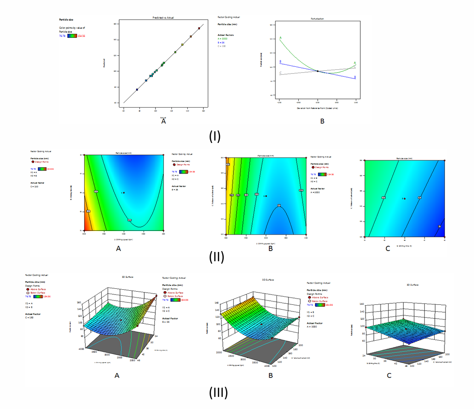 Fig. 1: I. (A) Comparison between predicted and actual values on mean particle size; (B) Perturbation plot displaying the effect of A, B and C on particle size. II and III. Contour and 3D response surface plots exhibit interactive effect between independent variables