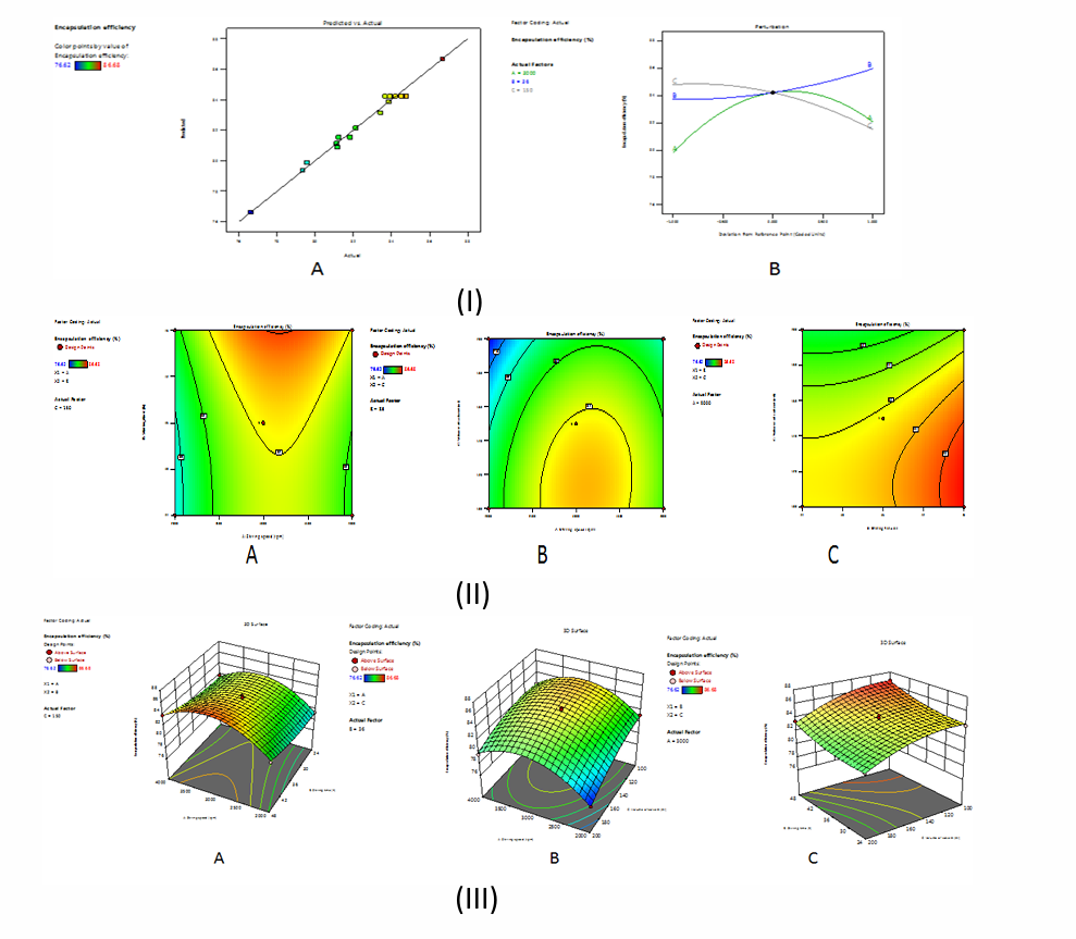 Fig. 2: I (A) The Comparison of predicted and actual values on Encapsulation efficiency; (B) Perturbation plot based on the effect of A, B and C on Encapsulation efficiency. IIandIII. Contour and 3D Response surface plots based on the interactive effect between independent variables