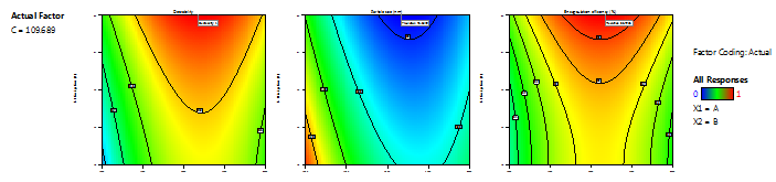 Optimisation of selected variable-influenced response parameters used Derringer's desire function (D). The responses (mean particle size and encapsulation efficiency) formed a desirability scale. Each response's aim function (D) was Ymax and Ymin. Contour plots show the relationship between fitted responses for two components in each plot. The graph's darkest section showed ideal values. In fig. 3, 3D contour plots showed the relationship between two variables on X-and Y-axes and a response value on Z-axis.