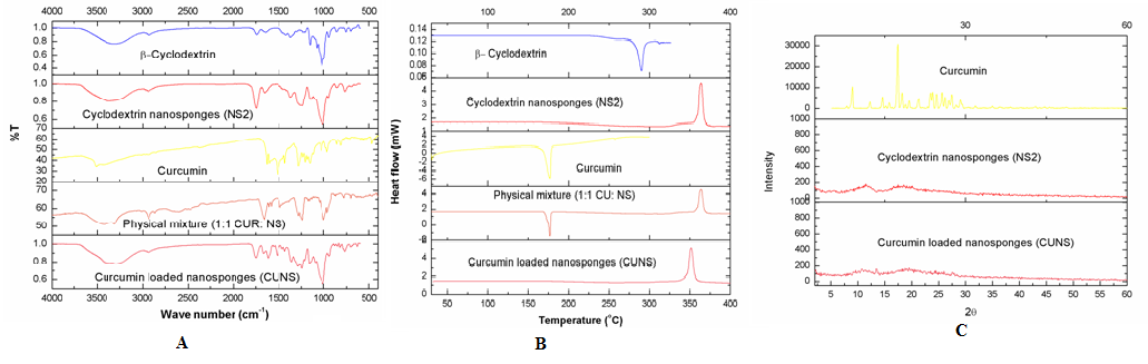 Fig. 5: (A) FTIR spectra of β-CD, plain NSs, Curcumin, Physical mixture and Curcumin loaded NSs; (B) DSC thermograms of β-CD, plain NSs, Curcumin, Physical mixture and curcumin-loaded NSs; (C) XRPD pattern of Curcumin, plain NSs and curcumin loaded NSs complexes