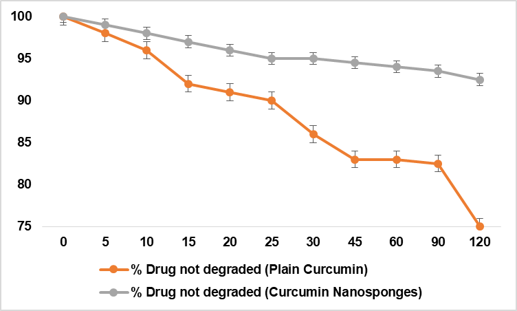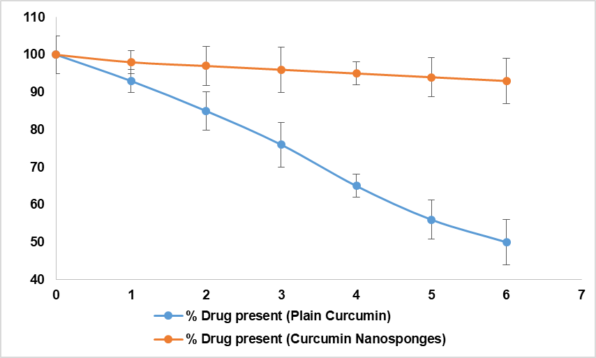 Free and complexed CU were irradiated separately to measure photodegradation. (fig. 6B). CU without NS degrades faster than free CU. CU's strong NS encapsulation may explain this. CU from formulations deteriorated faster in the first 30 min. CU on NS may produce this [34]. In six hours, free CU fell by roughly 50% in simulated intestinal fluid, whereas the encapsulated versions, shown in fig. 6C, did not. Inclusion complexes are hypothesised to protect medications from the stomach [35].