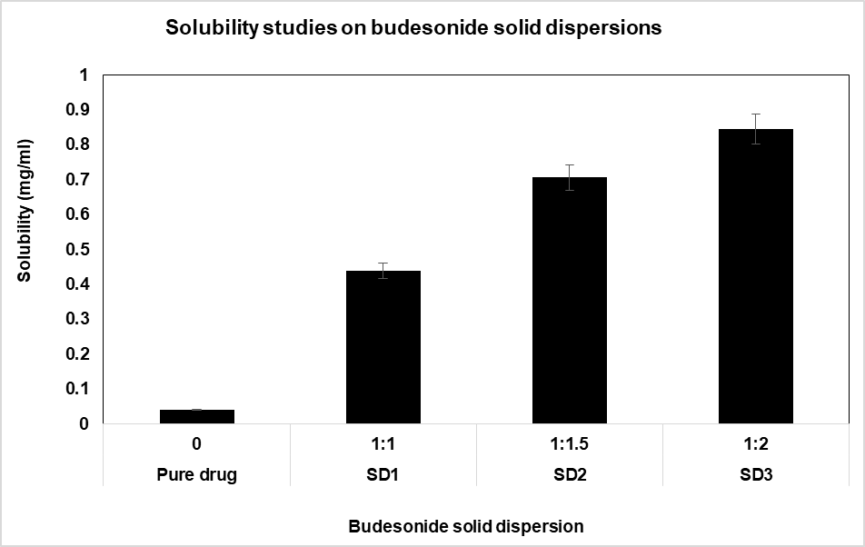 The Solid dispersions dissolution rate depends on the proportion of the poloxamer 188 in the solid dispersions. An enhancement of dissolution rate of budesonide is because of its amorphous state, which increases the as increase of the weight fraction of the poloxamer 188 up to its saturation solubility. From the solubility data it was found that there is drastic improvement in solubility with an increment in the carrier concentration i. e. poloxamer 188. As the desired solubility achieving with 1:2 drug and carrier ratio, the same will be used for further preparation of CPOP tablets.