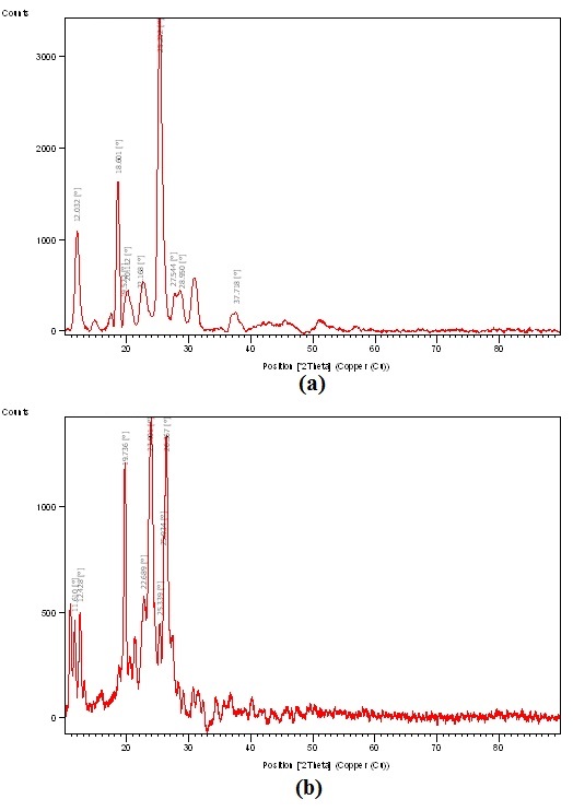 Fig. 2: XRD spectrum of a) Pure budesonide, b) Budesonide solid dispersion