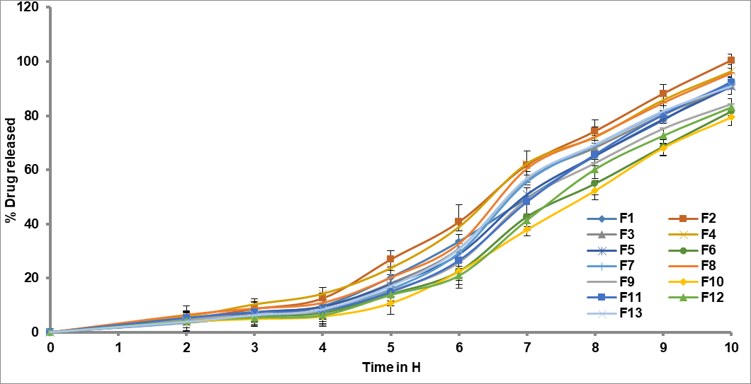 Factors having a significant impact on the response factors were optimized using Box-Behnken design [30]. The model-suggested formulations were made and further optimization was also done to get the best suitable formulation with desired responses (R1-% drug release after 4 h (D4), R2-% drug release after 7 h (D7), R3-% drug release after 10 h (D10). The general model corresponds to the following equation: