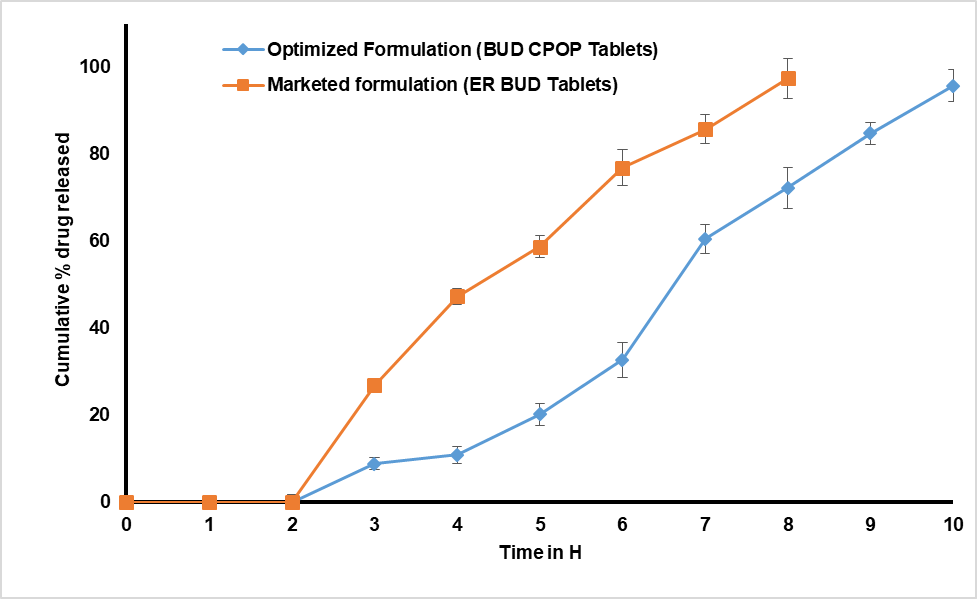 Fig. 4: In vitro dissolution profile of BUD CPOP colon target tablets and marketed BUD extend release tablets,