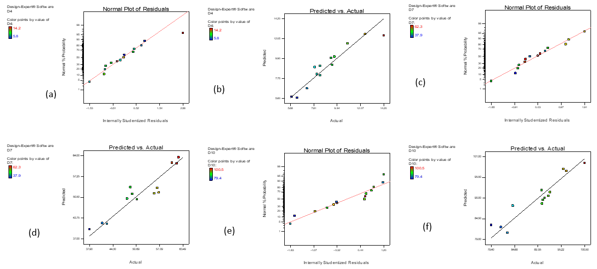 Fig. 4: a) Normal plot of residuals for the Response D4, b) Predicted versus actual plot for the Response D4, c) Normal plot of residuals for the response D7 d) Predicted versus actual plot for the Response D7, e) Normal plot of residuals for the response D10 d) Predicted versus actual plot for the response D10