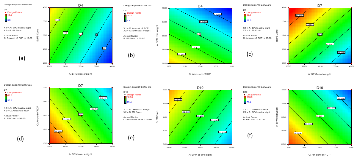 Fig. 5: Contour plot showing the effects of a) the factors A and B on the D4; b) the factors A and C on the D4; c) the factors A and B on the D7, d) the factors A and C on the D7, e) the factors A and B on the D10, f) factors A and C on the D10