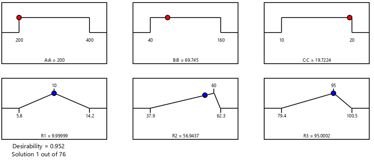 R3 =+81.60-3.95A-2.56B-1.11C-0.9000AB+1.85AC-4.48BC+5.56A2+5.54B2+2.59C2-……………. (3)
