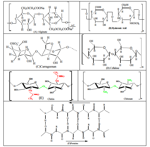 Fig. 1: Chemical structures of some natural polymers of potential to electrospinning: (A) Alginate, (B) Hyaluronic acid, (C) Carrageenan, (D) Cellulose, (E) Chitin and Chitosan, (F) Proteins [109]